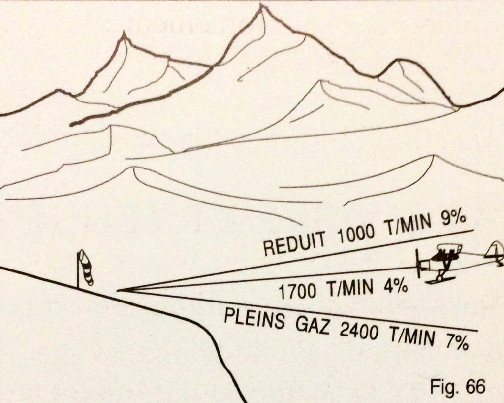 On va donc chercher à se poser sur des terrains en pente. En plaine, c’est le vent qui détermine le sens de l’atterrissage et du décollage : vent dans le nez. Aussi, avions au décollage ou atterrissage en plaine évoluent sur la piste dans le même sens. En montagne, c’est la pente qui impose le sens. On se pose dans le sens de la montée, on décolle dans le sens de la descente.